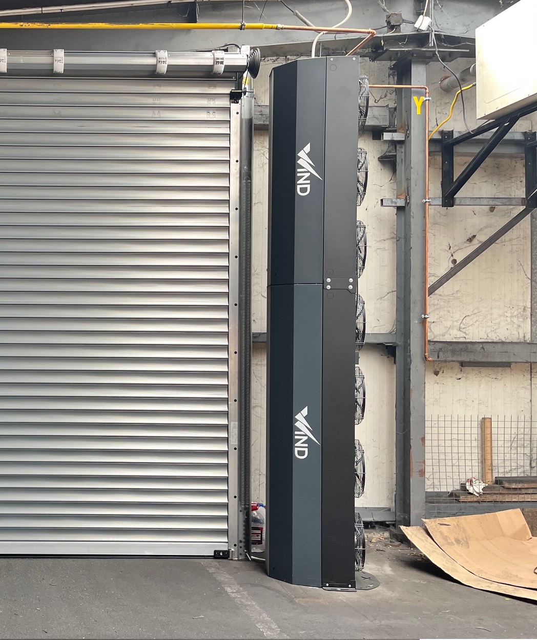 Vzduchová clona vrat průmyslového skladu..